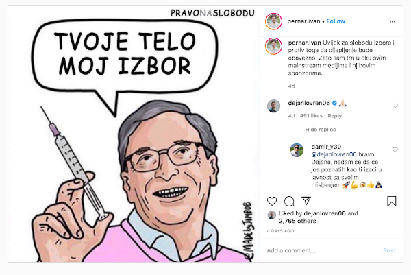 В материала на 101greatgoals е показана реакцията на Ловрен на карикатура с антиваксърско послание, на която съооснователят на Microsoft Бил Гейтс държи спринцовка и казва: "Тялото е твое, изборът е мой". Картинката е публикувана в Instagram от хърватския политик Иван Пернар, а защитникът на Ливърпул е коментирал с emoji "молещи се ръце".