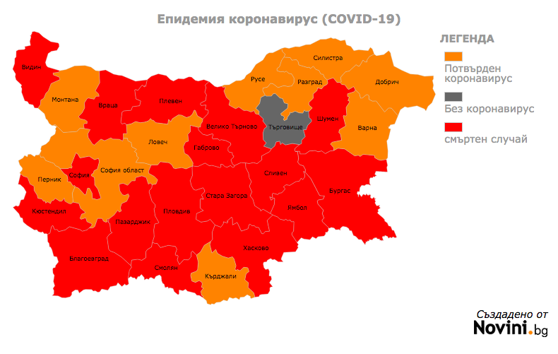 Починалите лица, при които е установен COVID-19, са общо 80. В областната болница във Велико Търново е починал мъж на 80 г. Пациентът е страдал от диабет, бил е с перитонит и перфорирана язва. В МБАЛ Севлиево е починал 61-годишен мъж с диабет и артериална хипертония.