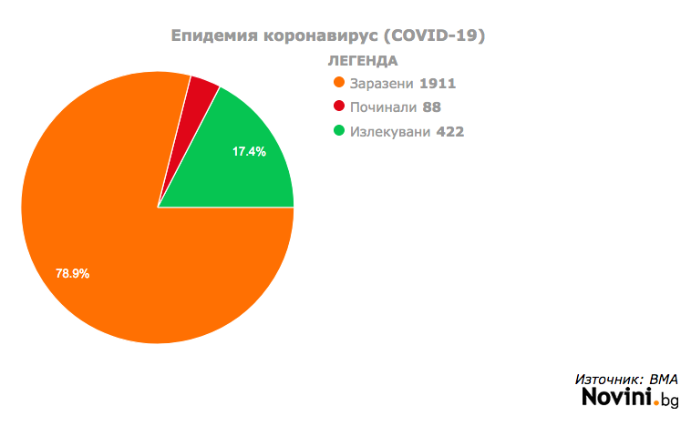 През последните 24 часа са доказани още 46 нови случая на COVID-19. Така болните вече са 1911.