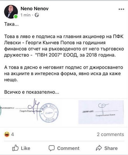 Икономистът Нено Ненов, който е известен с честото си участие и мнение по икономически теми в българския спорт, излезе с интересно мнение в личната си страница във “Фейсбук”. Той направи сравнение между два подписа на юридическия собственик на Георги Попов в годишния финансов отчет на ръководеното от него търговско дружество - “ПВН 2007” ЕООД за 2018 година. Подписът му е сравнен с този от джиросването на акциите на ПФК Левски днес, в което има видими разминавания.