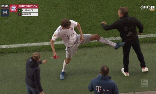 Мюлер бе заменен в 89-а минута и заради правилото за социално дистанциране не поздрави Флик с традиционното ръкостискане, а го ритна отзад. Моментът попадна в телевизионните обмени и предизвика противоречиви реакции. Според мнозина Мюлер е прекалил, като подобна шега е подходяща за някои от неговите съотборници, но не и за старши треньора.