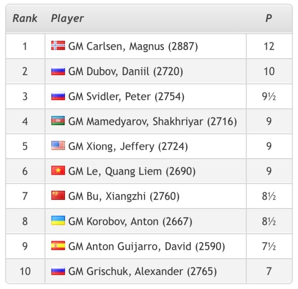 Норвежецът събра 12 точки от 18 възможни и си осигури победата кръг преди края на състезанието. Лидерът след първите два дни Дубов в последния кръг допусна три поредни поражения, спечели една партия и постигна две ремита. Така той остана втори в класирането с 10 точки.