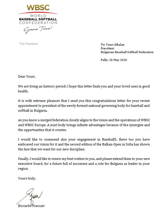 Президентът на световната бейзболна и софтболна конфедерация (WBSC) Рикардо Фракари изпрати поздравително писмо до новия президент на обединената Българска федерация по бейзбол и софтбол (БФБС) – Юрий Алкалай. Съоснователят на най-стария бейзболен клуб у нас Академици (София) беше избран за ръководител на общия управленски орган в началото на март след взетото решение за сливане на съществувалите досега поотделно федерации по бейзбол (БФБ) и по софтбол (БФС).