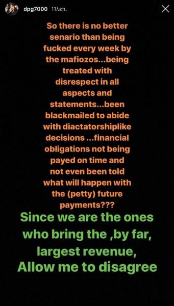 "Значи няма по-добър сценарий от това всяка седмица да бъдем ш*бани от мафиотите... Да бъдем третирани с неуважение във всички аспекти и изявления... Да бъдем изнудвани да спазваме задълженията, които са подобни на диктатура, да не ни се плаща навреме и дори да не знаем какво ще се случи с бъдещите ни плащания??", отговори Янакопулос на изказването на Бертомеу, че "Панатинайкос знаят, че няма по-добър сценарий извън Евролигата".
