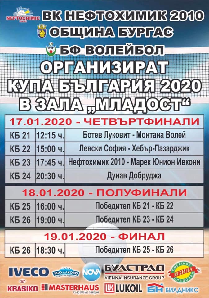Финалът в турнира за Купата на България при волейболистите, на който бургаската зала "Младост" е домакин, е на 19 януари (неделя) от 18:30 часа."Вярваме, че както и досега бургазлии ще подкрепят отбора", обявиха от ръководството на ВК Нефтохимик 2010.