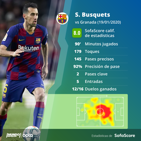 Полузащитникът на Барселона Серхио Бускетс изигра мач на високо ниво снощи срещу Гранада, отчита Mundo Deportivo, позовавайки се и на статистиката. Халфът на “лос кулес” се чувстваше много добре при изнасянето на топката в схема 3-5-2 и голяма част от атаките минаваха именно през него. Серхио завърши мача със 145 точни подавания (92% прецизност), повече от всеки друг на терена, сочат цифрите на Opta.