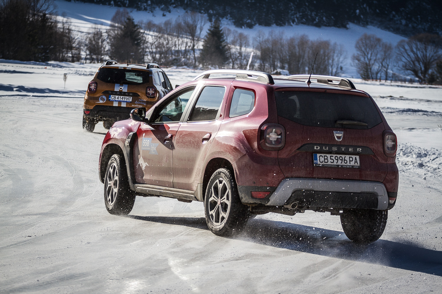 И така, след като получихме указания от Димитър Илиев как да подходим с управлението на лед, с Dacia Duster започнахме да "танцуваме" с най-продавания автомобил у нас по упражнения на сняг и след тях преминахме към каране по завоите на прекрасно подготвеното ледено трасе с дължина от 1100 метра и много разнообразни завои. Задвижването на четирите колела на Duster помагаше при контролираното пързаляне по завоите и даде възможност всички на пистата да се забавляваме на фона на величествената Рила.