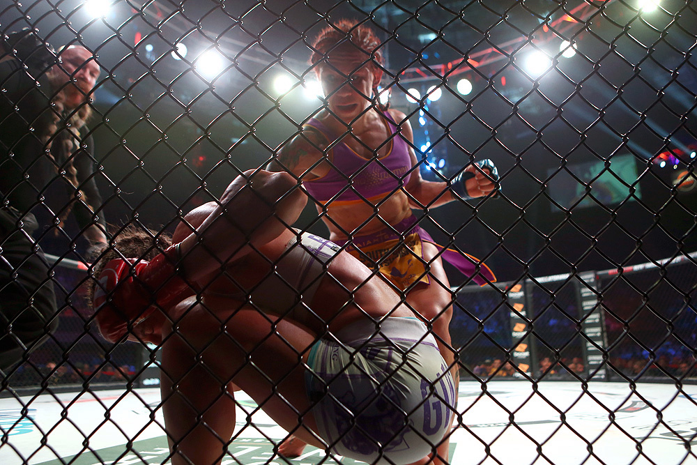 Бразилката не показа никаква милост и удряше здраво, докато Бъд не падна на колене и рефера се намеси, за да я спаси.