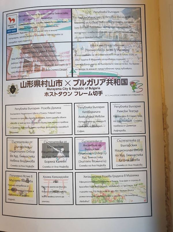 “Уважаема г-жо Раева, първо бих желал да Ви благодаря за ползотворното съдействие и за подкрепата, която оказвате за доброто сътрудничество между град Мураяма и БФХГ. За да почетем добрите взаимоотношения между БФХГ и нашия град, както и за да промотираме дейностите на града, ние направихме дизайн на пощенски марки с изображения на България и на български гимнастички. За дизайна на марките използвахме снимки, които са заснети от фотографите Анна Недкова и Димитра Лефтерова. Марките са в ограничени количества и могат да бъдат закупени в Мураяма и Токио. Още в първия ден, когато бяха пуснати в продажба за матките имаше огромен интерес. Надявам се, че и Вие ще ги харесате. С удоволствие очаквам да продължим работата си с БФХГ и тази година и се моля за успешна 2020 година за "златните момичета". С най-добри чувства, Катсухико Ягучи," се казва в писмото на Кацухико Ягучи, получено днес в БФХГ.
