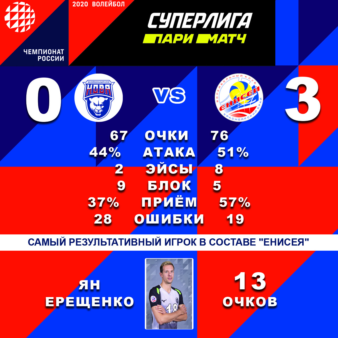 Тодор Скримов записа 12 точки (5 аса, 54% ефективност в атака, 23% перфектно и 54% позитивно посрещане). Най-резултатен за Енисей стана украинецът Ян Ерещенко с 13 точки (1 ас, 60% ефективност в атака, 28% перфектно и 53% позитивно посрещане).