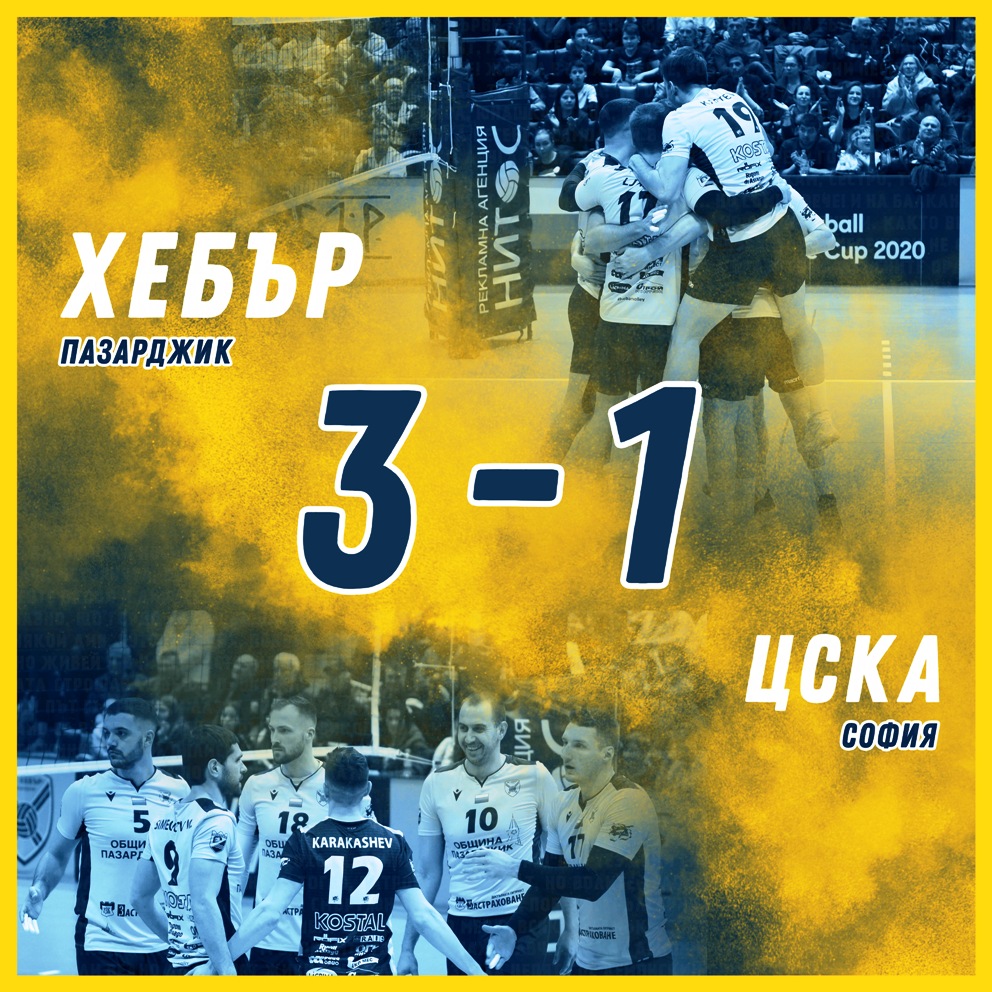 ХЕБЪР (ПАЗАРДЖИК) - ЦСКА 3:1 (25:14, 25:19, 25:27, 25:22)ХЕБЪР: Георги Братоев 2, Брадли Гънтър 19, Тодор Алексиев 10, Александър Ляфтов 15, Венцислав Рагин 7, Николай Къртев 11 - Петър Каракашев-либеро (Стойко Ненчев, Денис Чавдаров 1, Мартин Симеонов, Спас Байрев 2, Александър Симеонов, Любомир Агонцев)