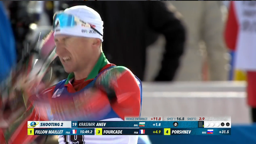 От българите с най-предни класиране е Красимир Анев, който финишира на 30-о място с две пропуснати мишени и пасив от 1:37.7 минута. Той беше шесто след първата стрелба, но сгреши два пъти във втората и остана 30-и.