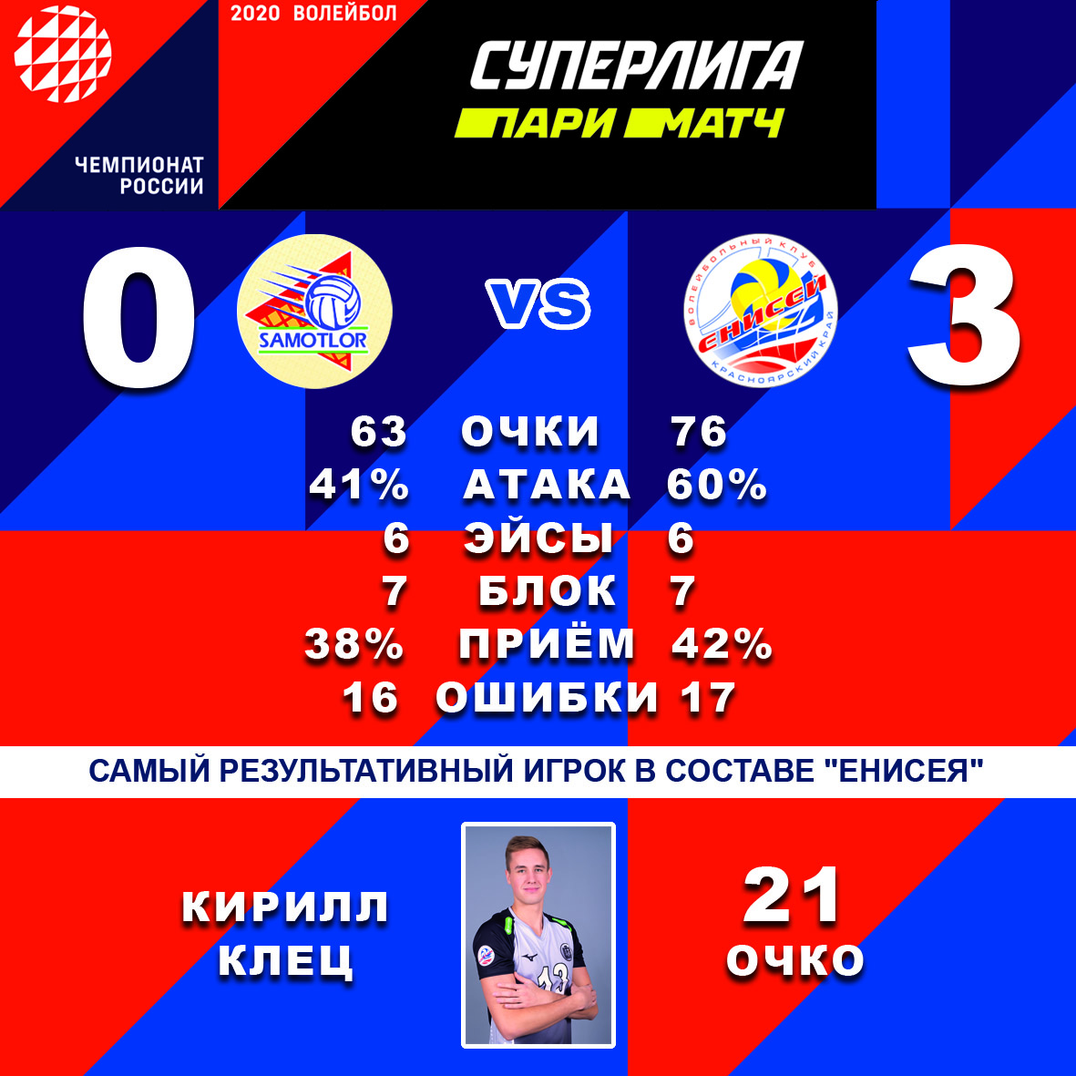 ЮГРА-САМОТЛОР (НИЖНЕВАРТОВСК) - ЕНИСЕЙ (КРАСНОЯРСК) 0:3 (24:26, 20:25, 19:25)
