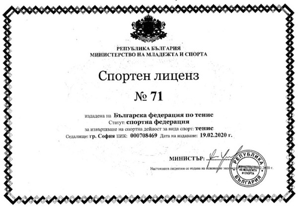 Министерство на младежта и спорта издаде на 19 февруари 2020 година сертификат за спортен лиценз номер 71 на БФТ със статут спортна федерация за извършване на спортна дейност за вида спорт: тенис и подписан от министър Красен Кралев.
