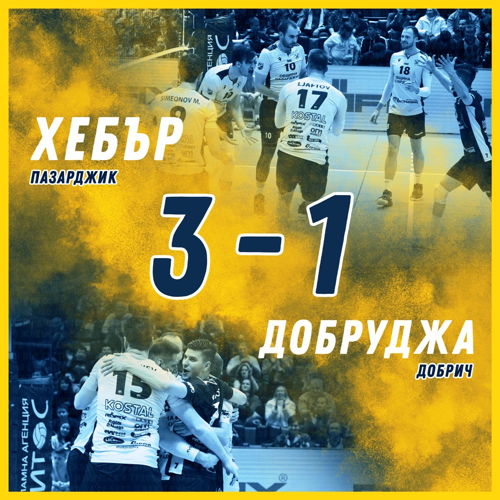 Носителят на Купата и Суперкупата на България Хебър (Пазарджик) записа своята 14-а победа в Суперлигата при мъжете. Играчите на Атанас Петров обърнаха и се наложиха у дома над Добруджа 07 (Добрич) с 3:1 (21:25, 25:20, 25:19, 25:18) в най-интересния мач от 17-ия кръг, игран тази вечер в пълната зала "Васил Левски".