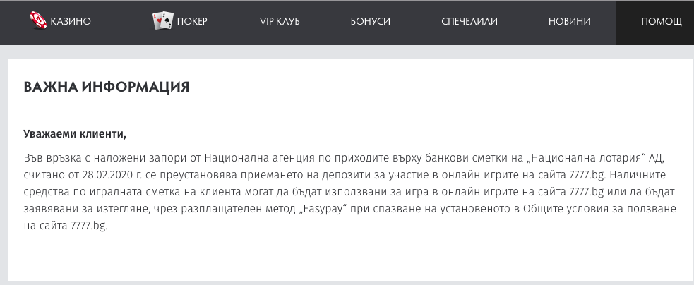 Във връзка с наложени запори от Национална агенция по приходите върху банкови сметки на “Национална лотария” АД, считано от 28.02.2020г. се преустановява приемането на депозити за участие в онлайн игрите на сайта 7777.bg. Наличните средства по игралната сметка на клиента могат да бъдат използвани за игра в онлайн игрите на сайта 7777.bg или да бъдат заявявани за изтегляне, чрез разплащателен метод “Easypay” при спазване на установеното в Общите условия за ползване на сайта 7777.bg”.