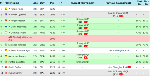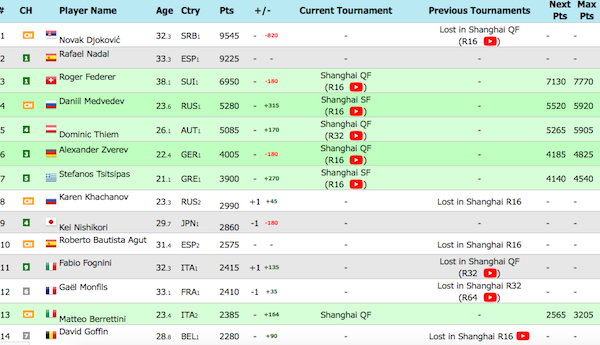 В ATP Race, където се отчитат само спечелените от началото на годината точки, Надал вече има преднина от над 1000 точки пред сърбина. Рафа, който не участва в Шанхай тази седмица и му предстои сватба, е лидер с 9225 точки, а Ноле е с 1280 точки по-малко на втората позиция.