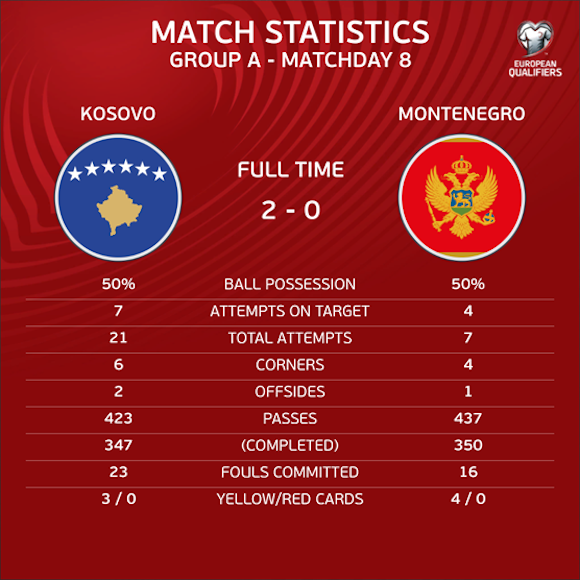 Косово запази шансове за класиране на Евро 2020, след като победи с 2:0 Черна гора в Прищина. Головете паднаха още преди почивката и бяха дело на Амир Рахмани и Ведат Мурики. Косоварите продължават да преследват второто място, доближавайки се само на точка зад Чехия. Черногорците пък се озоваха на дъното в групата, заедно с България.