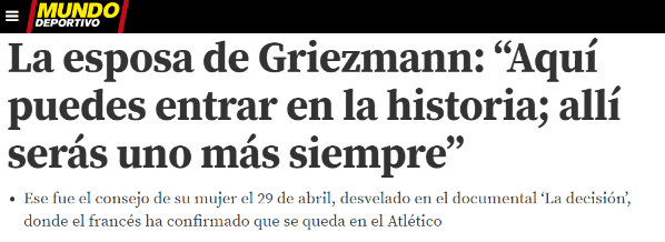 В някои моменти отекват думите на неговата съпруга Ерика от дръзкия документален филм „Решението“, която изказа на глас едно пророчество: „В Атлети можеш да влезеш в историята. В Барса ще бъдеш просто един от всички.“