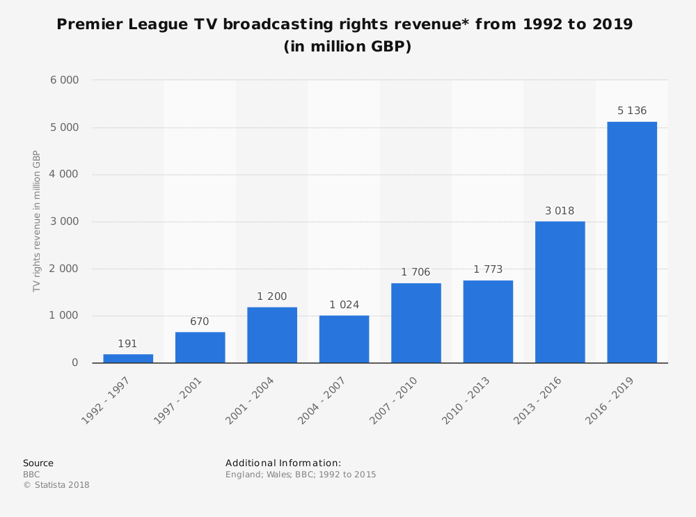 В първите 17 години на съществуване на Премиър Лийг стойността на телевизионните права скочи от 50 млн. на цели 800 млн. паунда, а при все това е забележително, че 20-те клуба имаха по-малки оперативни печалби през 2008/09 в сравнение с 1996/97. Колкото повече пари получаваха, толкова повече трябваше да харчат, за да задържат позициите си.