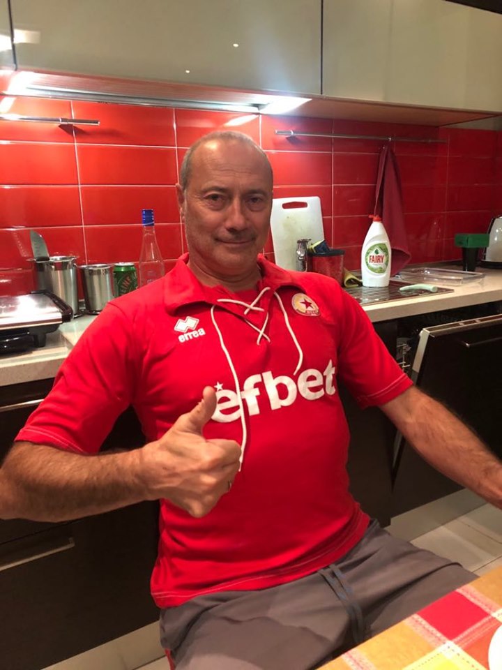 Легендарният полузащитник на Левски Емил Велев, който е последният наставник извел "сините" до шампионската титла, се появи по екип на ЦСКА 1948. Любопитната снимка беше публикувана от колегите от "Гонг", като Кокала се е снимал с вдигнат палец в червена кухня. Нашата медия научи вероятната причина за деянието на Велев, известен и като Джеймс - той е сключил бас за прилична сума с един от шефовете на Нефтохимик преди вчерашния мач на "шейховете" с ЦСКА 1948, завършил 4:0 за столичани.
