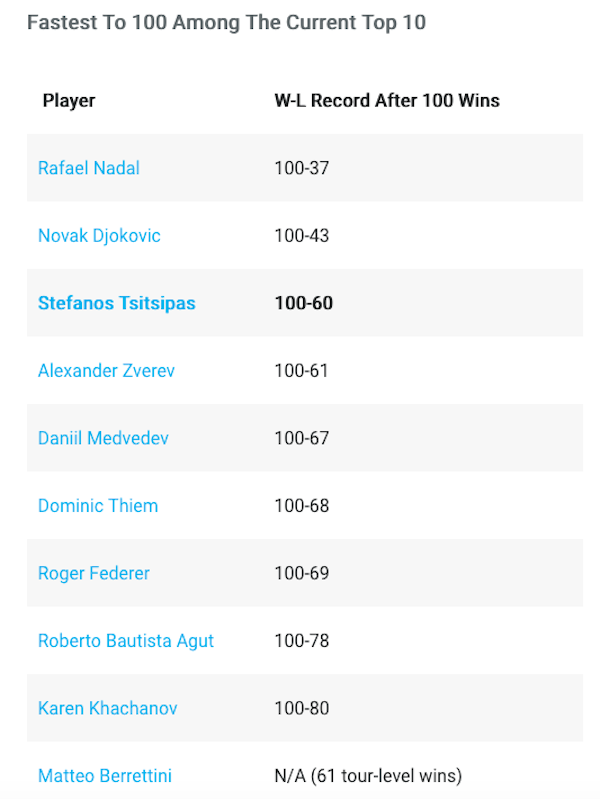 На Надал са му били необходими едва 137 срещи за победа №100, а на Джокович - 143. Любопитното е, че Циципас е постигнал своята победа №100 по-бързо от самия Роджър Федерер, на когото са му били нужни с 9 мача повече.
