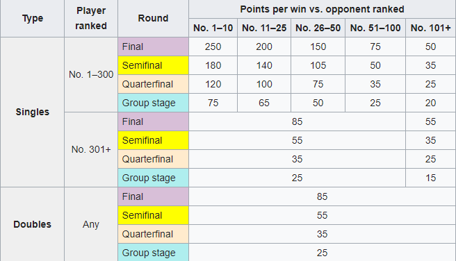 Точки се заработват с всяка една победа в турнира, а колко са те зависи от позицията на победителя в ранглистата, както и мястото на опонента му. Ако играч измежду първите 300 победи представител на топ 10 в груповата фаза, той ще получи 75 точки. Ако това се случи на четвъртфинал – 120 точки, на полуфинал – 180, а на финал – 250.