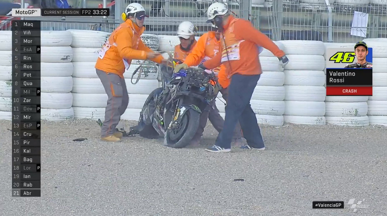 Деветкратният шампион в мотоциклетизма Валентино Роси претърпя два инцидента в петъчните тренировки на испанската писта "Рикардо Тормо" - по един в двете сесии. Италианецът от Тавулия падна в 12-ата минута от втората тренировка във Валенсия на десетия завой. Заради инцидента той трябваше да смени мотора и състезателния си костюм и се върна на пистата 13 минути преди края на сесията, като така изпусна половината тренировка. Вижте как изглеждаха състезателния му костюм и мотора му след падането.