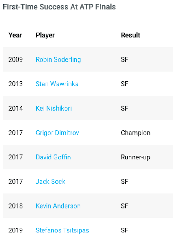 Григор е единственият от началото на новото хилядолетие, който успява да спечели престижния турнир при дебютното си участие. Хасковлията срази Давид Гофен на финала през 2017 година, като белгиецът също бе дебютант. Циципас ще повтори това, ако утре се справи в директния спор за трофея с миналогодишния шампион Александър Зверев или Доминик Тийм.