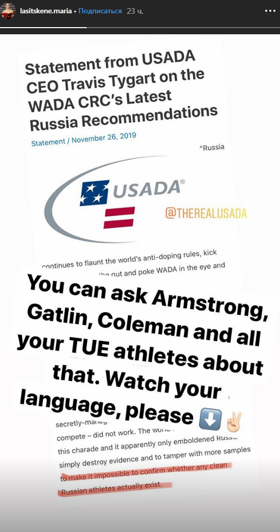 “Може да питате (Ланс) Армстронг, (Джъстин) Гатлин, (Крисчън) Коулман и всички ваши спортисти за това. Мерете си приказките, моля”, написа Ласицкене в Instagram.