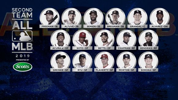 Бейзболисти от 11 различни клуба попаднаха в първия в историята идеален отбор на сезона в МЛБ. Тимът на 2019 г. беше съставен след онлайн гласуване на феновете и експертна оценка на екип специалисти от лигата, като двете страни формираха по 50% от избора.