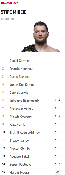Непобеденият боец в тежка категория Жаирзиньо Розенструйк полетя в класирането, след като записа победа над Алистър Овърийм. Страшилището от Суринам се изкачи с 9 места и зае 5-тото място в тежка категория. Овърийм от своя страна падна с 2 места и се установи на 8-ма позиция. Това предизвика сериозно разместване и Благой Иванов - Багата изпадна от топ 10 и зае 11-ото място в класирането.