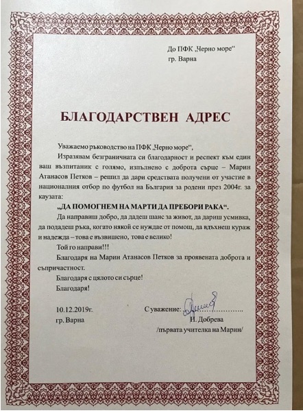 ПФК Черно море получи благодарствен адрес. Поводът е повече от впечатляващ. Младият талант от академията на “моряците” Марин Атанасов дари средствата, получени от националния отбор на България за родени 2004 година, за благотворителна инициатива – “Да помогнем на Марти да пребори рака”.