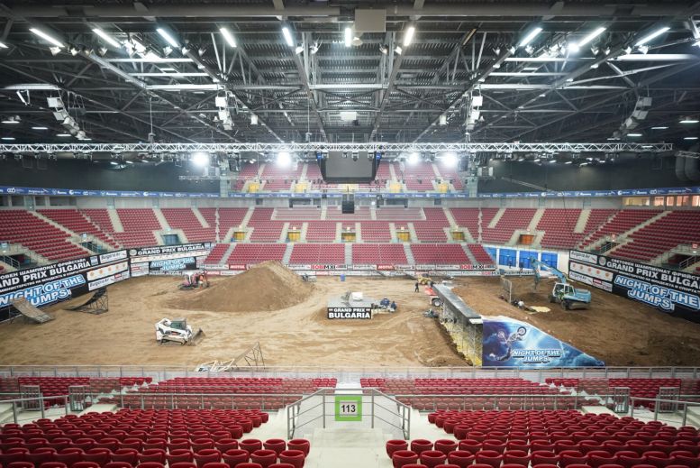 Вече са изградени съоръженията за скоковете, поставени са рампите, както и настилката от 1200 кубика пръст. В момента вървят довършителните работи в залата, като до тази вечер всичко ще е приключило и готово за утрешния ден.