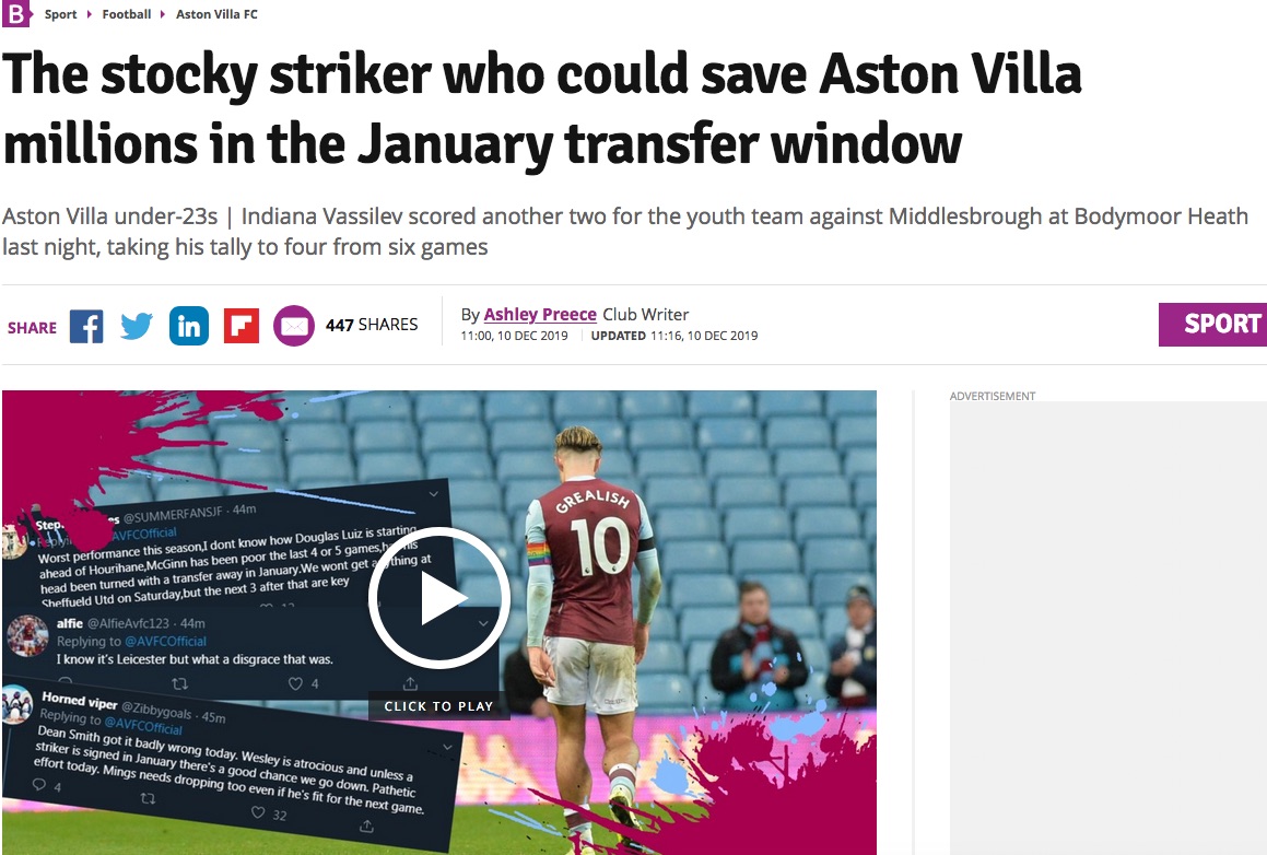Един от големите таланти на Астън Вила и английския футбол - Индиана Василев, който е с български корени, продължава да събира суперлативи за представянето си из терените на Острова. 18-годишният офанзивен футболист вече тренира с първия тим на бирмингамци, а за него авторитетният birminghammail излезе преди няколко дни с гръмкото заглавие “Нападателят, който може да спести милиони на Астън Вила през зимния трансферен прозорец”.