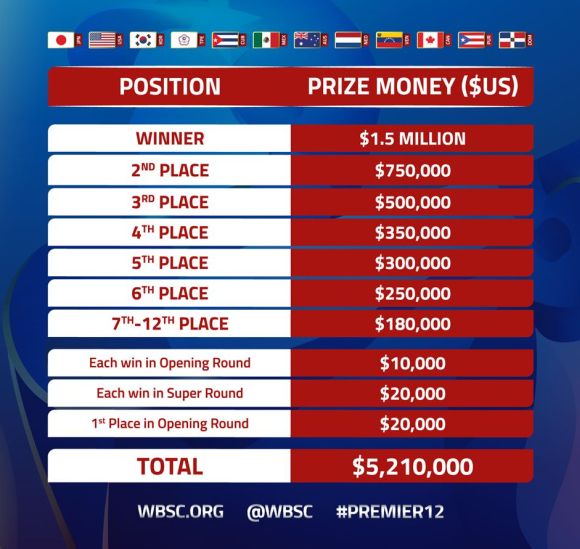 Наградният фонд за второто издание на световното първенство по бейзбол "Премиър 12" ще достигне $5,2 млн., обяви световната бейзболна и софтболна конфедерация (WBSC). Увеличението е с близо 40% спрямо дебютния турнир в този формат през 2015 г., когато участниците си разпределиха $3,8 млн.
