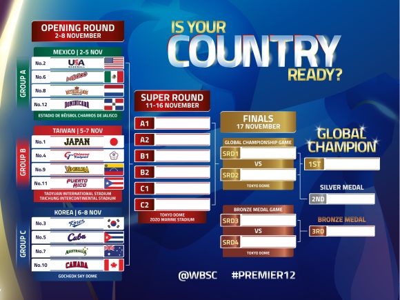 Самият турнир ще се проведе в четири държави на два континента и ще противопостави страните от Топ 12 на световната ранглиста по бейзбол за 2018 г. В група А в Гуадалахара (Мекс) са събрани №2 САЩ, №6 Мексико, №8 Холандия и №12 Доминиканска република; в група В в Тайчун (Тайв) са №1 Япония, №4 Тайван, №9 Венецуела и №11 Пуерто Рико; а в група С в Сеул (Кор) са №3 Корея (шампион от 2015 г.), №5 Куба, №7 Австралия и №10 Канада.