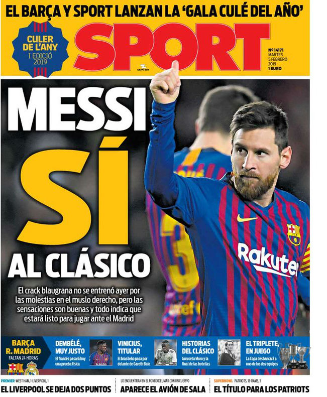 Каталунският вестник Sport показа увереност, че Лионел Меси е готов за игра и ще бъде на линия за двубоя Барселона - Реал Мадрид утре вечер. Барселонското издание излезе с първа страница, озаглавена “Меси - "да" на Ел Класико”. В подзаглавието пише: “Звездата на “блаугранас” не тренира вчера заради болки в десния мускул, но усещанията са добри и всичко сочи, че ще е готов да играе срещу Мадрид”.