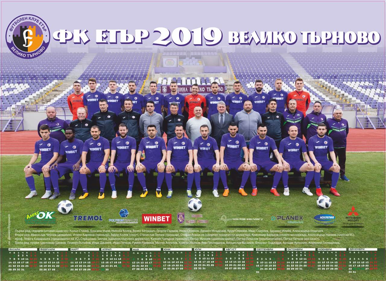 Ето как изглежда календарът на Етър за 2019 година. Той ще бъде пуснат в продажба преди първия мач срещу Дунав в неделя. Календарът ще бъде с цена 2 лв. и ще бъде продаван на касите за билети, така че всеки желаещ, освен билет, да може да си купи и него. Новият календар ще бъде продаван и след неделния мач.