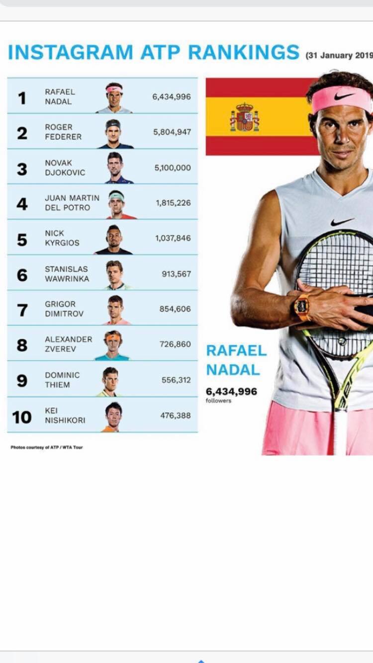Номер 1 в социалната мрежа е Рафаел Надал с 6 434 996 последователи, следван от Роджър Федерер (5 804 947), Новак Джокович (5 100 000), Хуан Мартин дел Потро (1 815 226), Ник Кирьос (1 037 846) и Стан Вавринка (913 567).