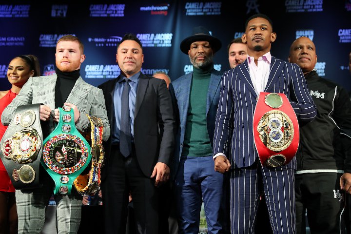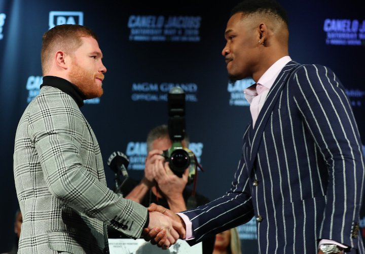 Шампионът в средна категория на WBC, WBA и списание “Ринг” Саул Алварес - Канело (50-1-2, 34 КО) се изправи лице в лице със следващия си противник на ринга - Даниел Джейкъбс (35-2, 29 КО) преди дългоочаквания им сблъсък в “Т-Мобъл Арина” в Лас Вегас на 4 май.