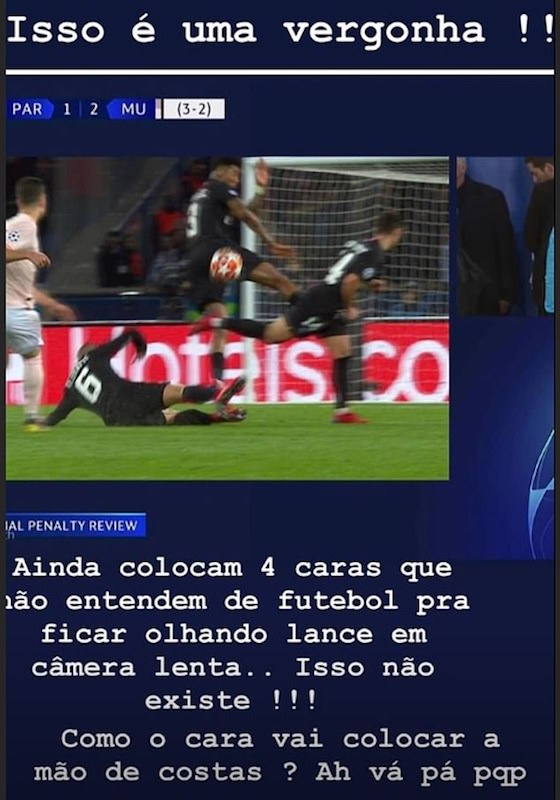 Звездата на Пари Сен Жермен Неймар бе бесен на съдиите след отпадането на тима му от Шампионската лига. Френският шампион загуби с 1:3 реванша с Манчестър Юнайтед на “Парк де Пренс” и отново приключи участието си в турнира още на 1/8-финала. Бразилецът не взе участие в мача тъй като лекува контузия, но след срещата изригна в социалните мрежи с нецензурни думи срещу реферите на двубоя заради отсъдената в добавеното време на мача дузпа за гостите след намесата на технологията ВАР.