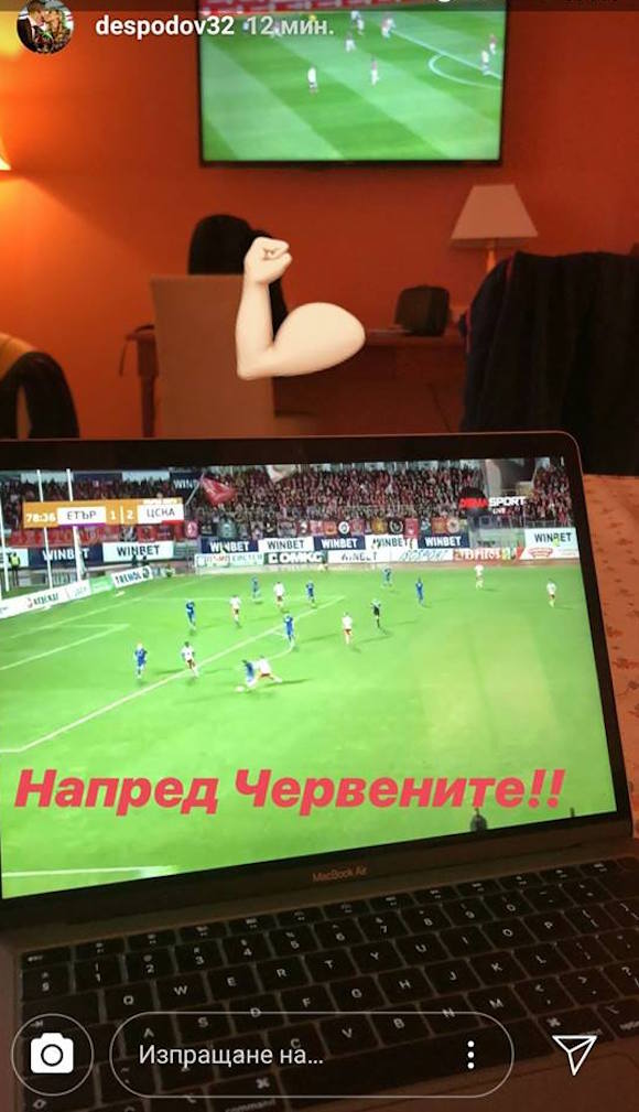 Десподов показа на последователите си в Instagram как гледа двубоя във Велико Търново на лаптопа си, а публикацията беше придружена с посланието: "Напред Червените!!"