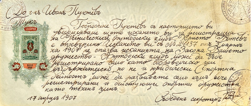 Господин Пухтев, с настоящето ви уведомяваме, че искането ви за регистрация на Ученически футболен клуб „Христо Ботев“ е отхвърлено. Искането ви с № 24137 от 5 март на 1907 година не спазва исканията на Закона. Вашето дружество – Футболен клуб може да бъде регистрирано само като доброволческо или въздържателско, но не и юридически. Спортна дейност може да развивате само към вече регистрирани и действащи спортни дружества, като техен член.