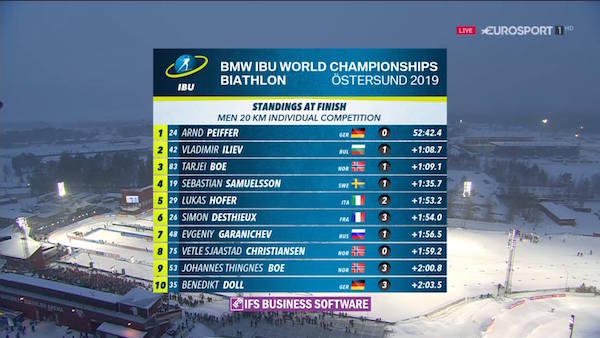 Единствения си пропуск Илиев допусна във втората стрелба (от положение “прав”). Само на 4 десети от секундата след българина остана норвежецът Тарей Бьо (1 грешка в стрелбата), който се нареди трети в крайното подреждане.