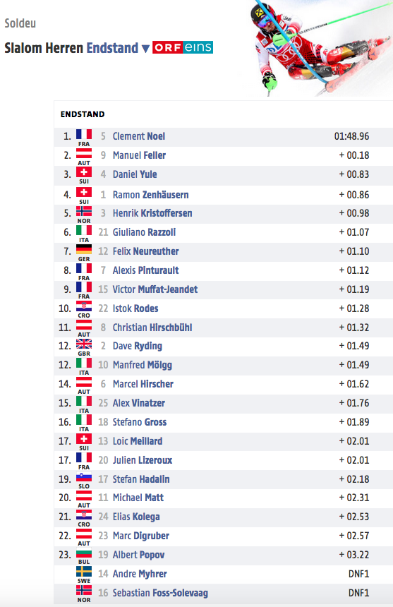 Втори на 18 стотни от секундата завърши австриецът Мануел Фелер, а трети на 83 стотни се нареди Даниел Юле от Швейцария.
