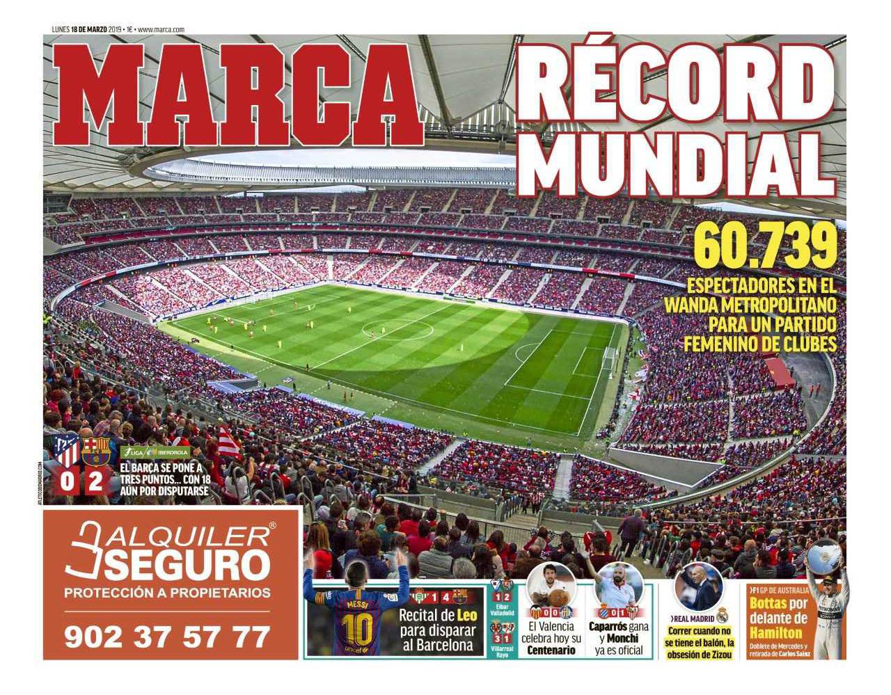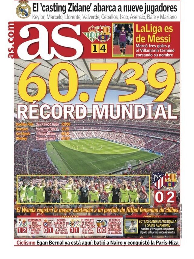 Световният рекорд за посещаемост на женски мач на клубно ниво завзе първите страници на водещите спортни вестници в Испания. Мадридските Marca и AS сложиха снимка на препълнения “Wanda Metropolitano” и отделиха мъничко място за Лионел Меси и неговия спектакъл в Севиля.
