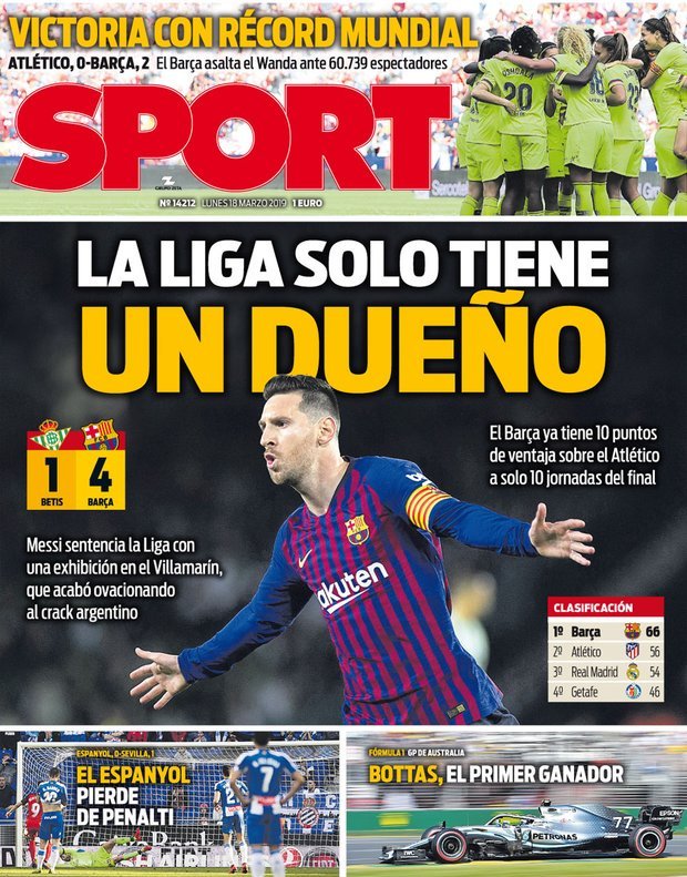 “Рецитал на Лео, който изстреля Барселона”, пише Marca в каре под голямата снимка на стадиона на Атлетико Мадрид. “60 739 - световен рекорд”, тръби AS с цел да привлече вниманието на своите читатели. Лео е сместен в горната част на първата страница с малка снимка и заглавие “Лигата на Меси”.