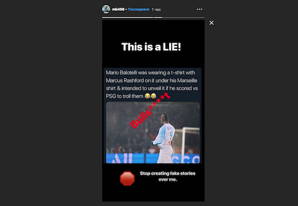 Нападателят на Марсилия Марио Балотели отрече информациите, че бил подготвял провокация спрямо Пари Сен Жермен по време на изминалото дерби от френския шампионат. В социалните мрежи се появи слух, че той бил облякъл фланелка на Маркъс Рашфорд от Манчестър Юнайтед, за да дразни ПСЖ при евентуален гол.