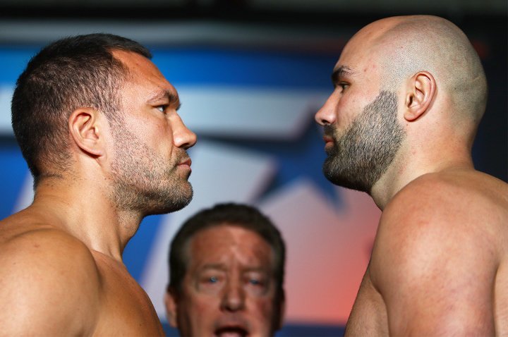 Кубрат Пулев и Богдан Дину минаха през кантара преди боя помежду си, който ще се проведе в "Хангара" в Коста Меса, Калифорния. Това ще е дебютен мач за Кобрата в САЩ. Срещата в тежка категория ще бъде в неделя сутрин около 5:00 часа българско време.